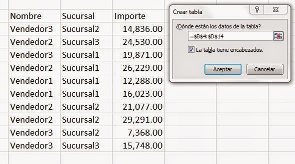 El procedimiento es muy simple, solamente seleccionamos cualquier parte del rango que ya tenemos y que deseamos convertir a tabla de excel, luego presionamos CONTROL+T, marcamos la opción “La tabla tiene encabezados” y aceptar.
