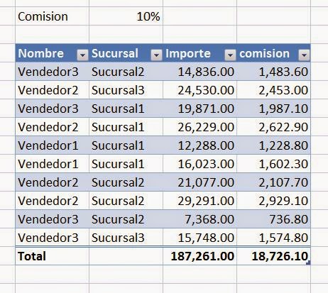 Para este ejemplo en particular, se agrego una nueva columna a la tabla “comisión”, en esa columna pusimos una formula en la primera fila =D5*$C$2 , al dar enter, esa formula se aplica automáticamente a todas las demás filas de esa tabla.